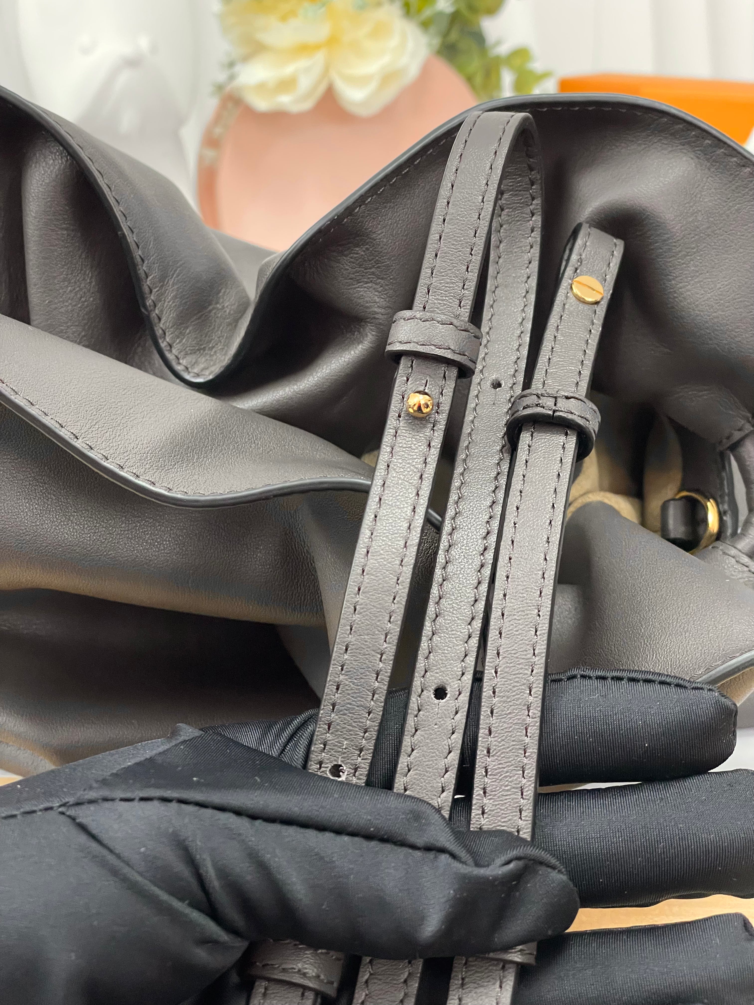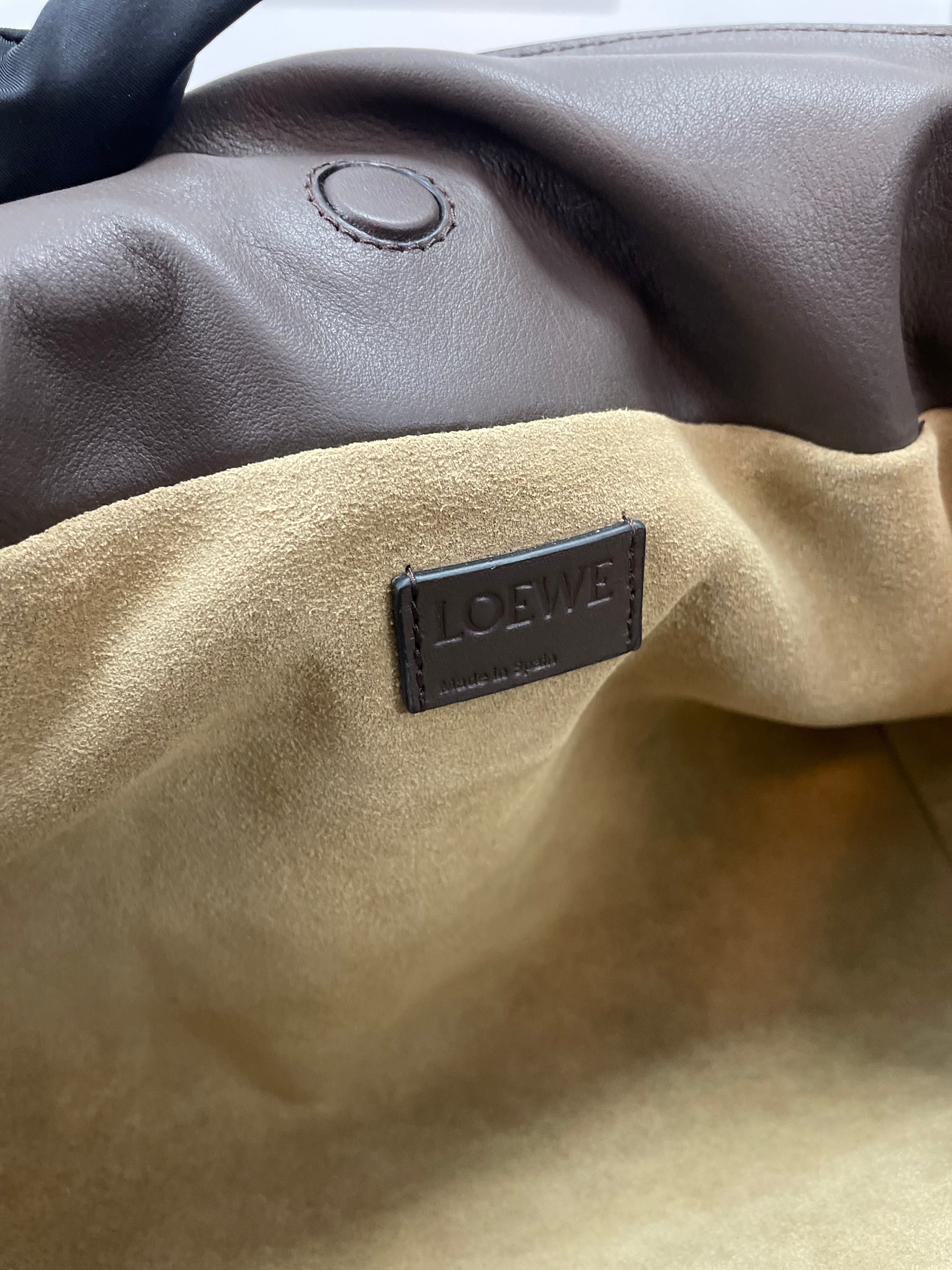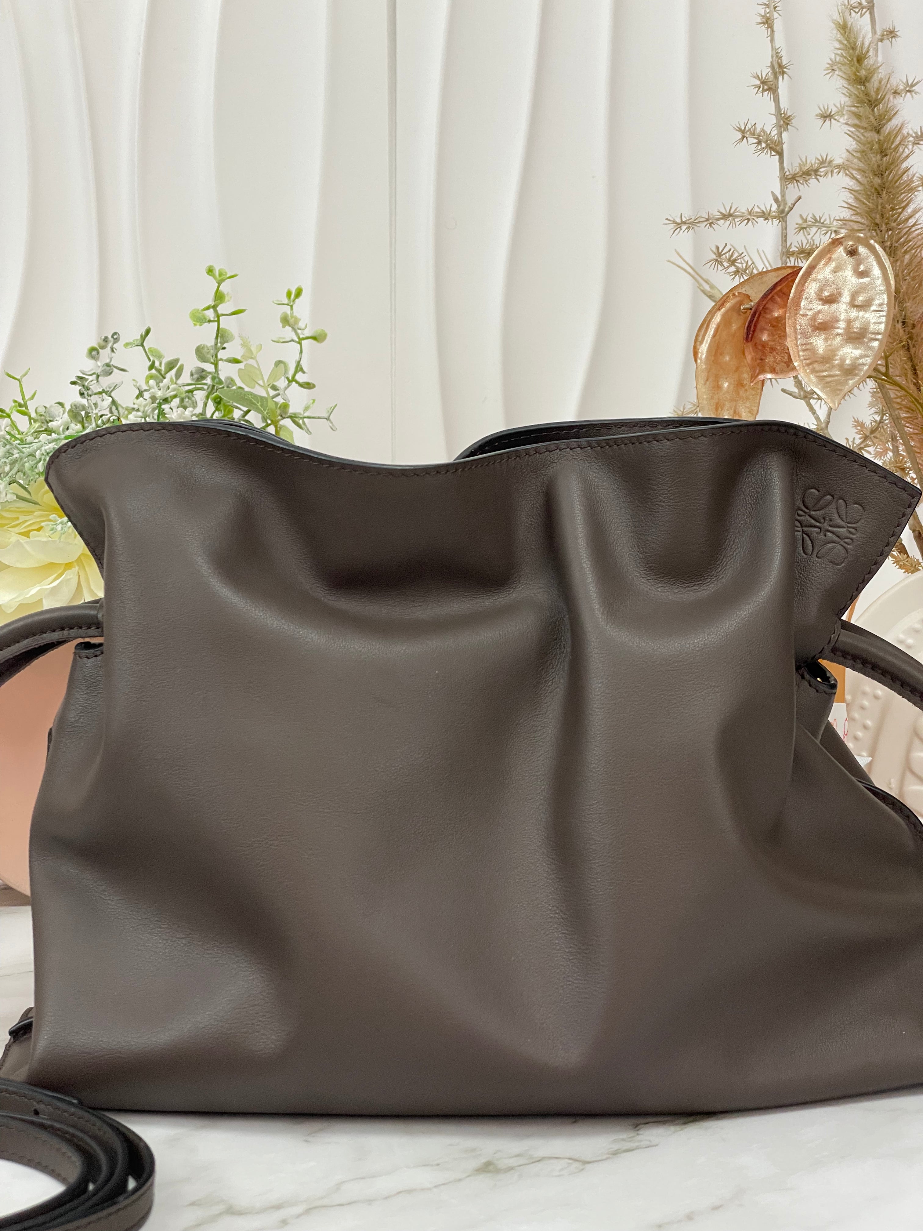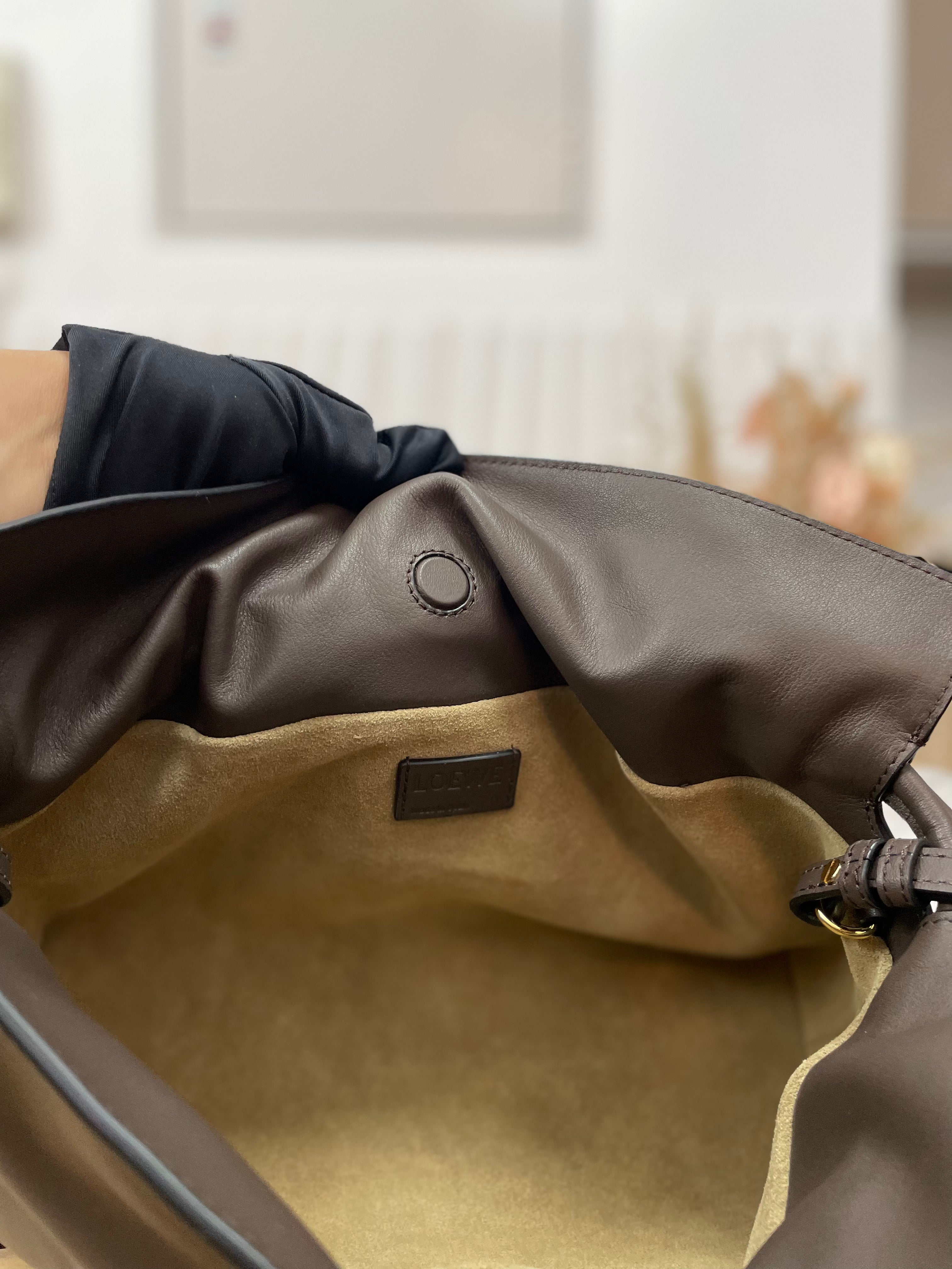 The Flamenco-style clutch is crafted from smooth calfskin leather, designed with a soft, ruched silhouette and signature drawstring closure. It includes a detachable, adjustable shoulder strap for versatile wear — from handheld to crossbody. Finished in a deep chocolate brown with gold-tone hardware, this piece channels quiet luxury with everyday practicality.