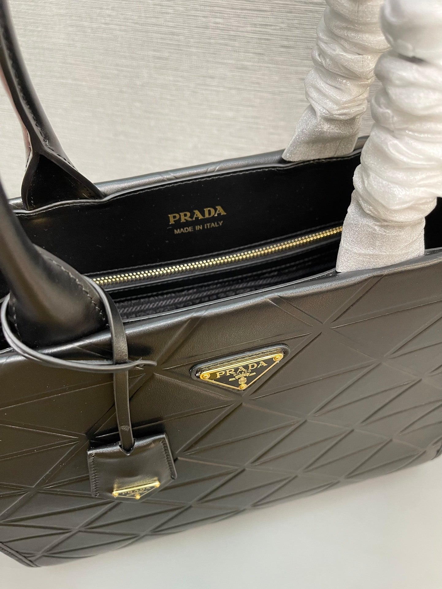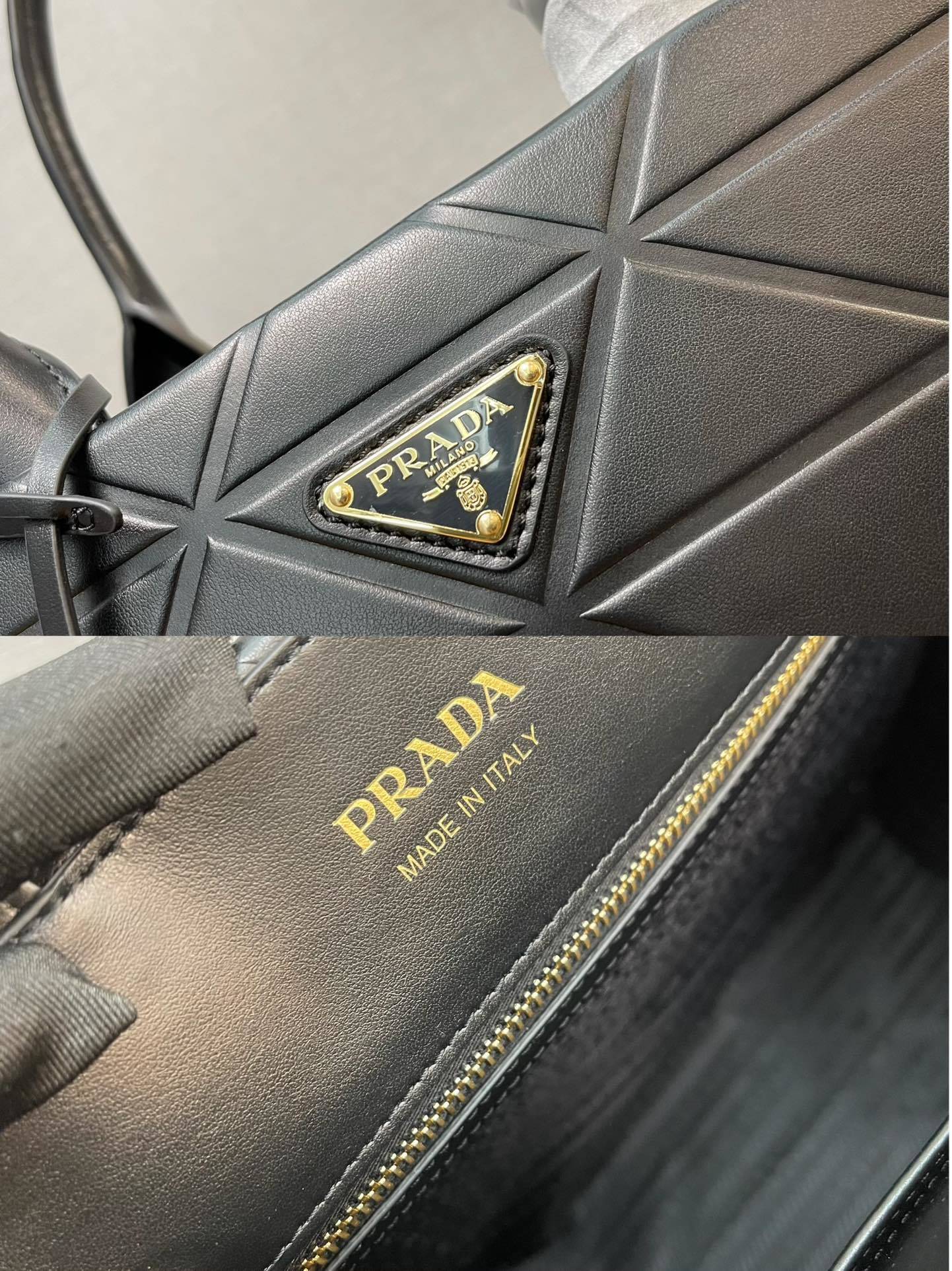 Signature Prada Hardware: The bag is finished with Prada’s signature gold-tone hardware, including the logo plaque and subtle accents, which add a touch of refined luxury to the bag’s clean, structured design.